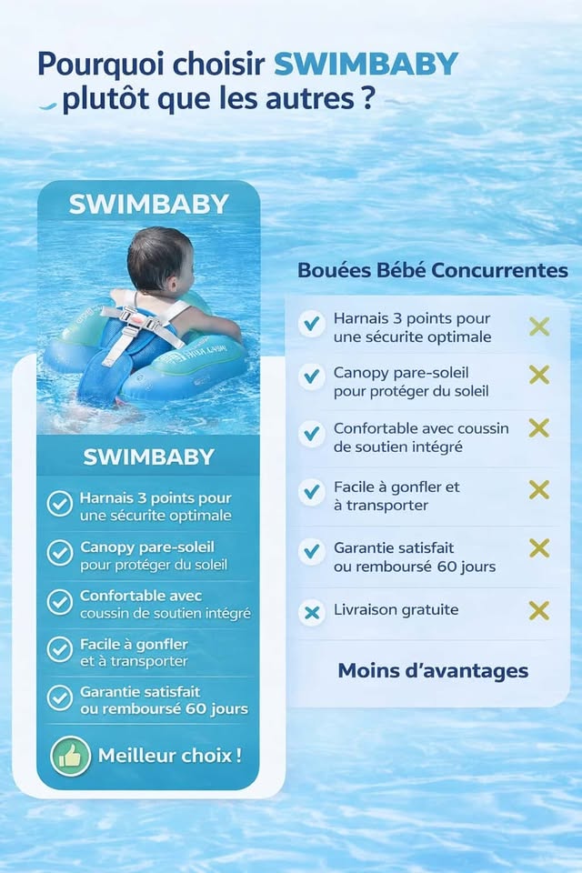Imaginez nager en toute sécurité, sans stress ni souci, le tout sans le moindre inconfort. Baby Swim est VOTRE solution. Simple, élégante et tellement confortable, elle rend les autres bouées dépassées.